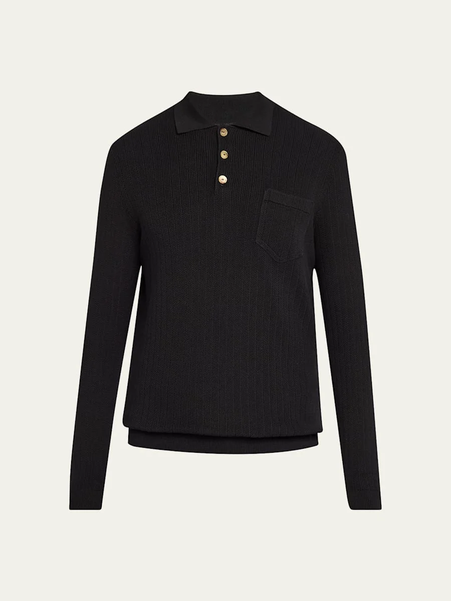 Brunello Cucinelli polo sweater in ribbed knit cotton Spread collar Three-button placket Chest patch pocket Long sleeves Ribbed cuffs and hem Pullover style Cotton Unlined Machine wash cold Made in Italy Online Inquiries: BGS21_NCQ4Y| Store Inquiries: #4927096
