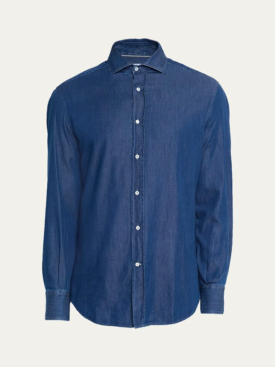 Brunello Cucinelli button-down shirt in lightweight cotton denim with a classic medium wash Genuine mother-of-pearl buttons Spread collar Button placket Long sleeves Double-button cuffs Pleated back yoke Curved hem Cotton Unlined Dry clean Made in Italy Online Inquiries: BGS21_NDGKA| Store Inquiries: #5039547