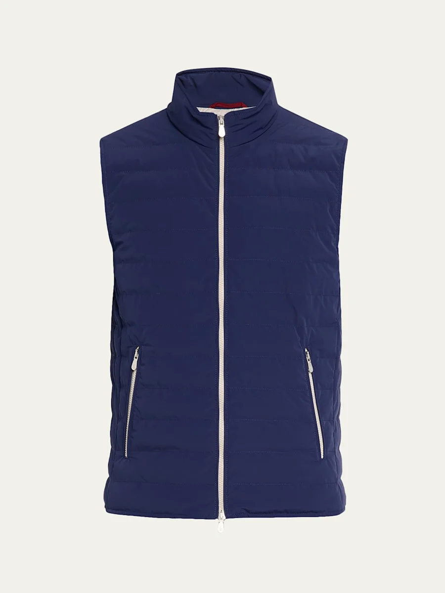Brunello Cucinelli vest in durable nylon with subtle quilting and contrast trim Down/feather padded fill Stand collar Two-way zip front Side zip pockets Sleeveless Nylon/polyamide/elastane Lining: Nylon Dry clean, machine wash line dry Made in Italy Online Inquiries: BGS21_NDGJK| Store Inquiries: #5039526