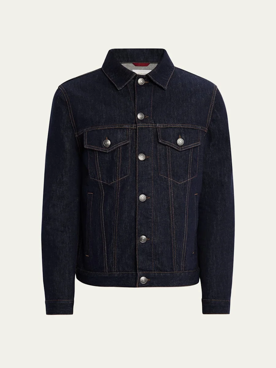 Brunello Cucinelli jacket in Italian selvedge denim accented with branded metal buttons Spread collar Button front Chest flap pockets Side welt pockets Long sleeves Single-button cuffs Hem adjusters Cotton Unlined Dry clean, machine wash line dry Made in Italy Online Inquiries: BGS21_NDGHR| Store Inquiries: #5039489