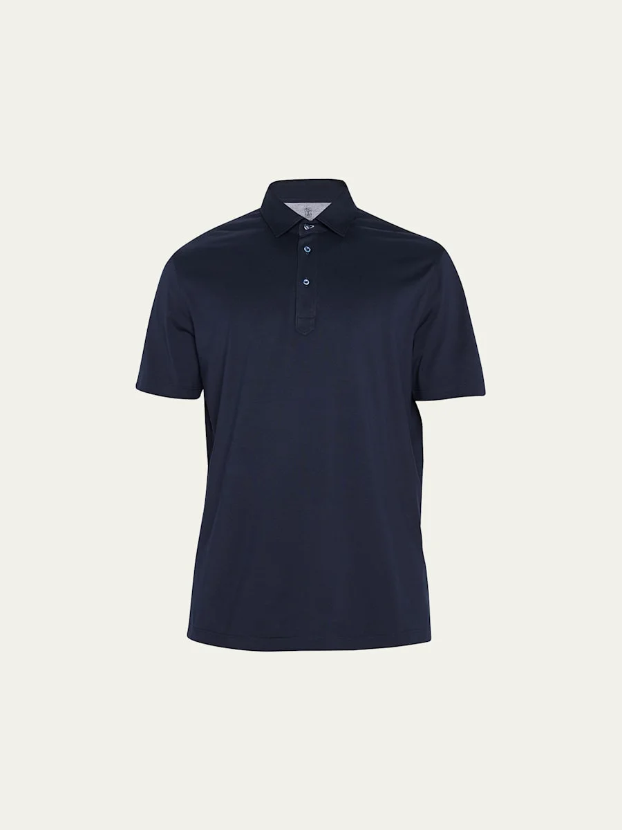 Brunello Cucinelli polo shirt in premium jersey fabric Spread collar Three-button placket Short sleeves Vented sides Pullover style Classic fit Jersey Made in Italy Model is 6'1"/185cm. Online Inquiries: BGS21_N97YF| Store Inquiries: #4303332