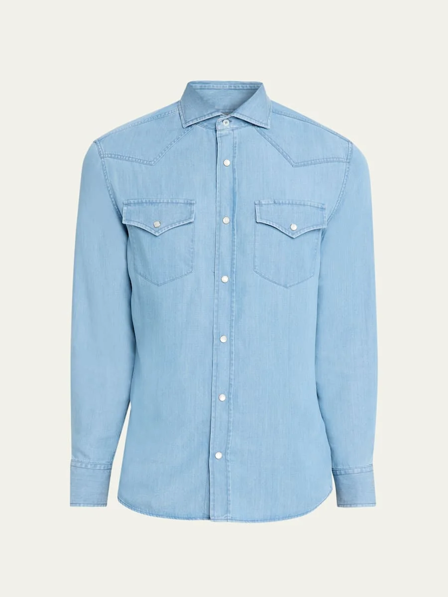 Brunello Cucinelli western shirt in comfortable and lightweight cotton denim Spread collar Chest flap pockets Snap placket Long sleeves Mitered barrel cuffs Western yoke Curved hem Cotton Unlined Machine wash line dry Made in Italy