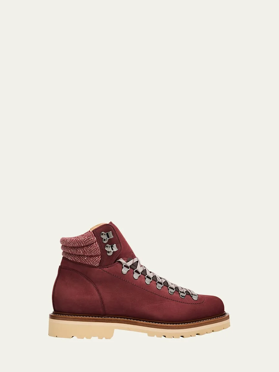 Brunello Cucinelli boots in soft nubuck leather defined by a comfortable herringbone fabric collar Chunky heel Round toe Lace-up vamp Metal hooks Lugged outsole Made in Italy Online Inquiries: BGS21_NDM6T| Store Inquiries: #5047303