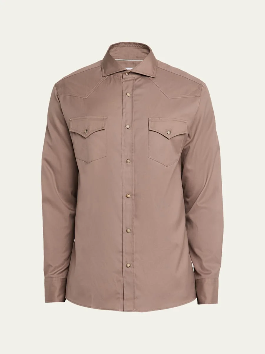 Brunello Cucinelli western shirt in piecedyed cotton and genuine horn buttons Spread collar Snap placket Long sleeves Western yoke Rounded hem Cotton Unlined Dry clean, machine wash line dry Made in Italy