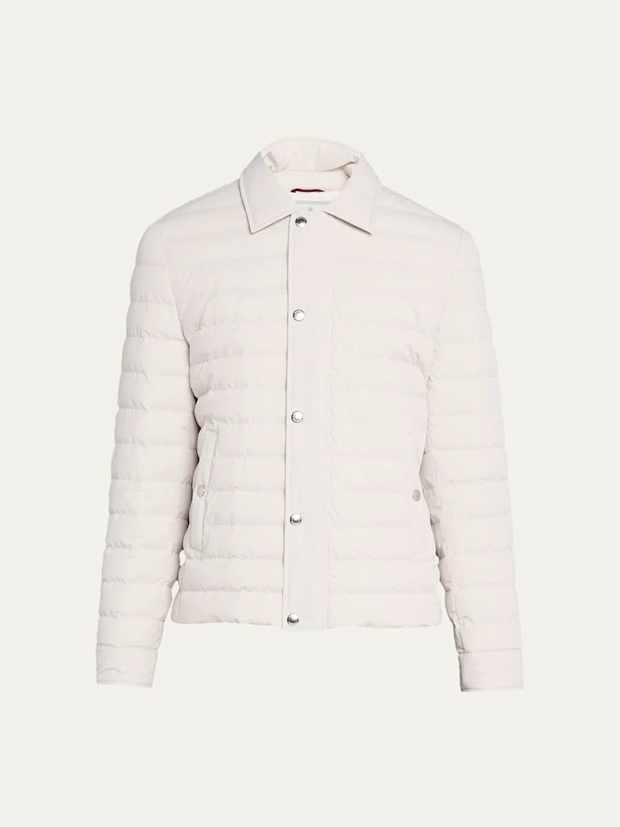 This quilted jacket from Brunello Cucinelli stylishly provides warmth. Let the polyester and down/feather fill caress you during the low temperatures. Point collar Snap/zip placket Side snap pockets Nylon/polyamide/elastane Lining: Nylon Dry clean, machine wash line dry Made in Italy