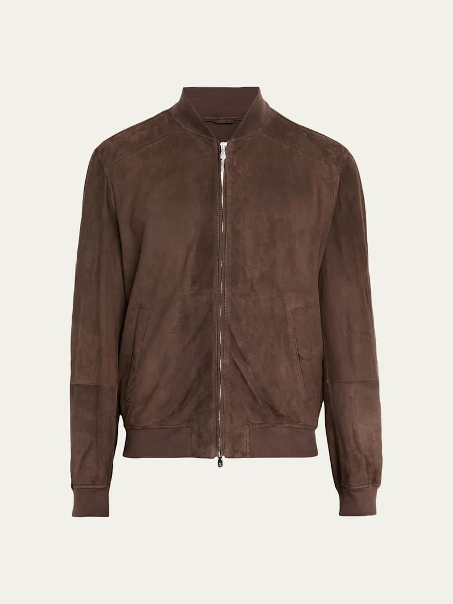 Brunello Cucinelli bomber jacket in supple suede with tonal cotton ribbed trim Baseball collar Twoway zip front Side welt pockets Long sleeves Ribbed cuffs and hem Suede/cotton Lining: Cupro Dry clean Made in Italy