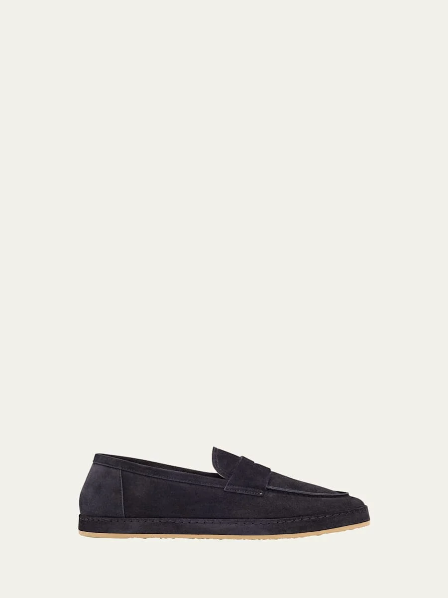 Brunello Cucinelli loafers in velvety suede for a timeless style of casual elegance Rubber outsole offers a secure, comfortable fit throughout the day Flat heel Round moc toe Penny keeper strap Branded footbed Leather lining Tonal midsole Slip-on style Made in Italy Online Inquiries: BGS21_ND3X3| Store Inquiries: #5021431