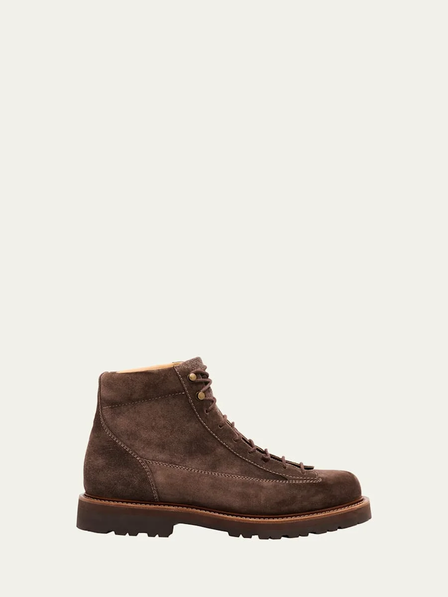 Ruggedly handsome Brunello Cucinelli hiker boots in velvety soft suede with tonal topstitching Round toe Lace-up vamp Lugged rubber sole Made in Italy Online Inquiries: BGS21_NDM6V| Store Inquiries: #5047305