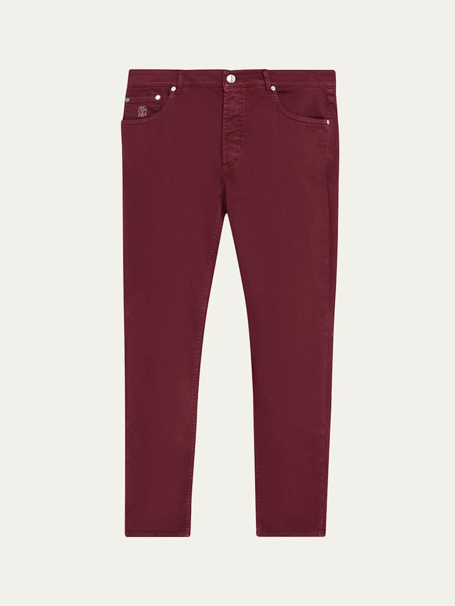 Brunello Cucinelli pants in garment dyed denim revealed in a traditional fit Regular rise Flat front Fivepocket style Back label Classic fit through slim legs Full length Buttonzip front; belt loops Cotton/elastane Machine wash line dry Made in Italy