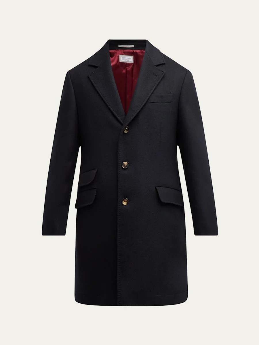 Brunello Cucinelli overcoat in wool Notched lapels Three-button front Barchetta chest pocket Three hip flap pockets Long sleeves Four-button cuffs Double-vented back Traditonal fit Wool Cotton/cupro lining Dry clean Made in Italy Model is 6'1"/185cm. Online Inquiries: BGS21_NC4U5| Store Inquiries: #4807152