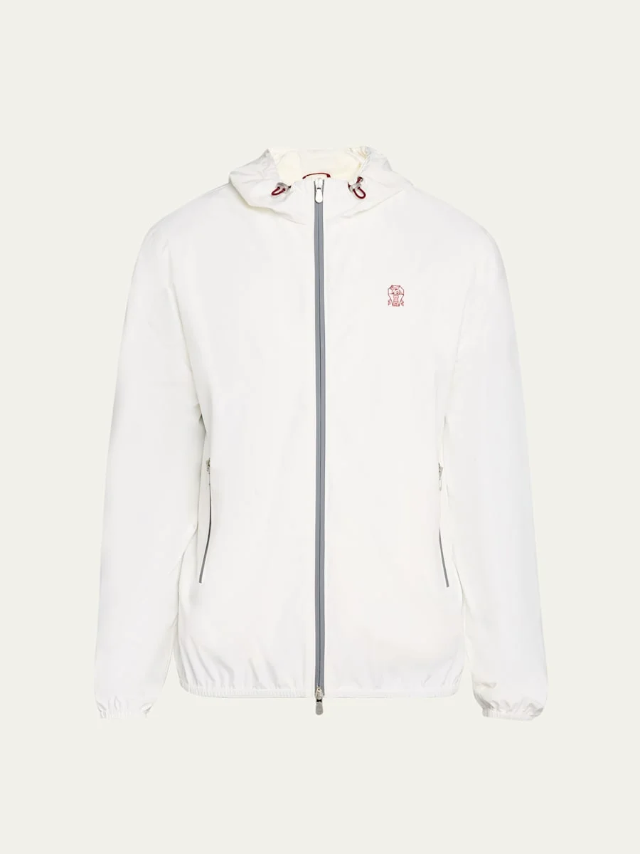 Brunello Cucinelli waterresistant jacket featuring the signature logo emblem on the chest Hooded drawstring neckline Twoway zip front Side zip pockets Long sleeves Elasticized cuffs and hem Nylon/elastane Made in Italy