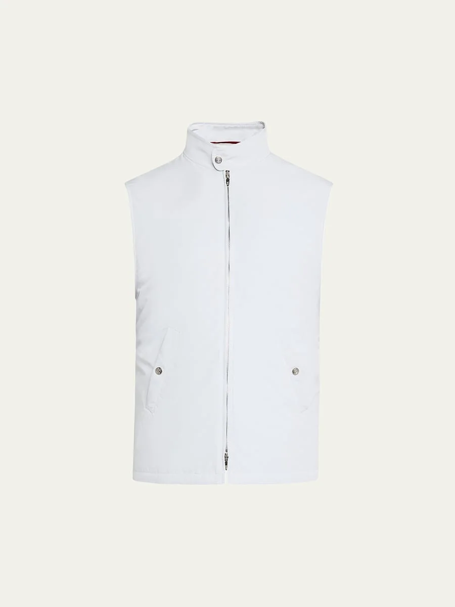 Brunello Cucinelli vest crafted in water resistant microfiber Stand collar; snap closure Two-way zip front Side slip pockets; snap closure Sleeveless Modern fit Polyester fill Polyester/nylon Lining: Nylon Hand wash Made in Italy Online Inquiries: BGS21_NCSGC| Store Inquiries: #4894865