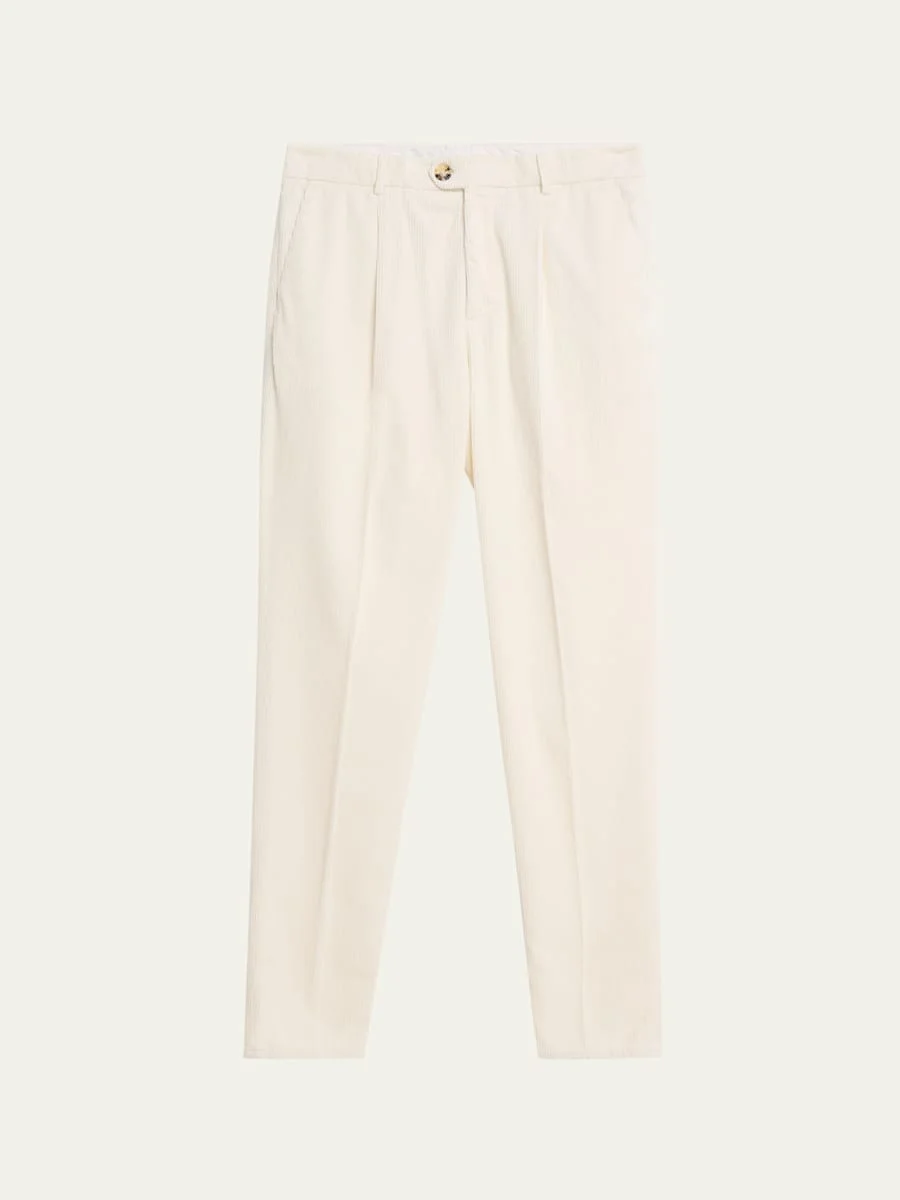 Made in a wide-wale corduroy, Brunello Cucinelli debuts these pure cotton trousers for a smart fit. Button/zip fly; belt loops Side slip pockets Single pleat at front Back welt pockets Straight legs Full length Cotton Made in Italy Online Inquiries: BGS21_NDL51| Store Inquiries: #5042693