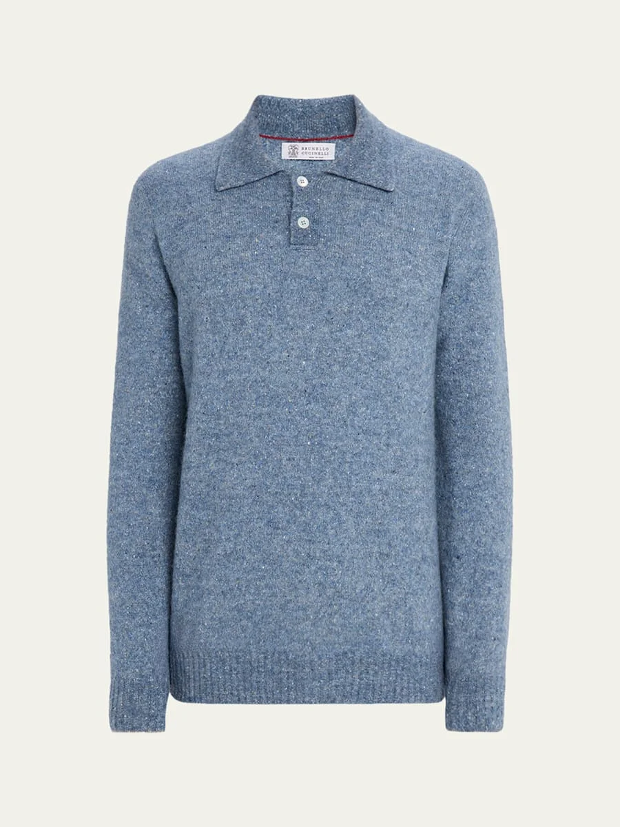 Brunello Cucinelli polo sweater in a warm wool blend resulting in a melange finish Spread collar Twobutton placket Long sleeves Ribbed cuffs and hem Pullover style Wool/nylon/polyamide Made in Italy