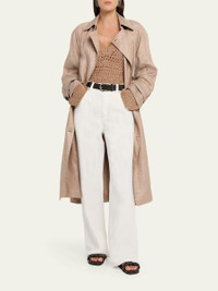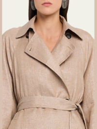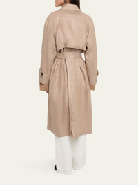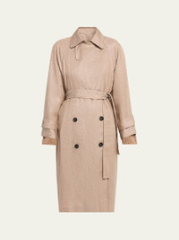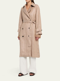 Brunello Cucinelli trench coat is crafted in a metallic linen-blend Trench collar with throat latch; double-breasted front Long raglan sleeves; button-tab cuffs Rainsheild back Self-tie belted waist Hip welt pockets Straight fit Hem falls below the knee Walking vent back Linen/nylon/polyamide/metallic fibers Lining: Acetate/silk Dry clean Made in Italy Online Inquiries: BGS21_BB1HZ| Store Inquiries: #5438617