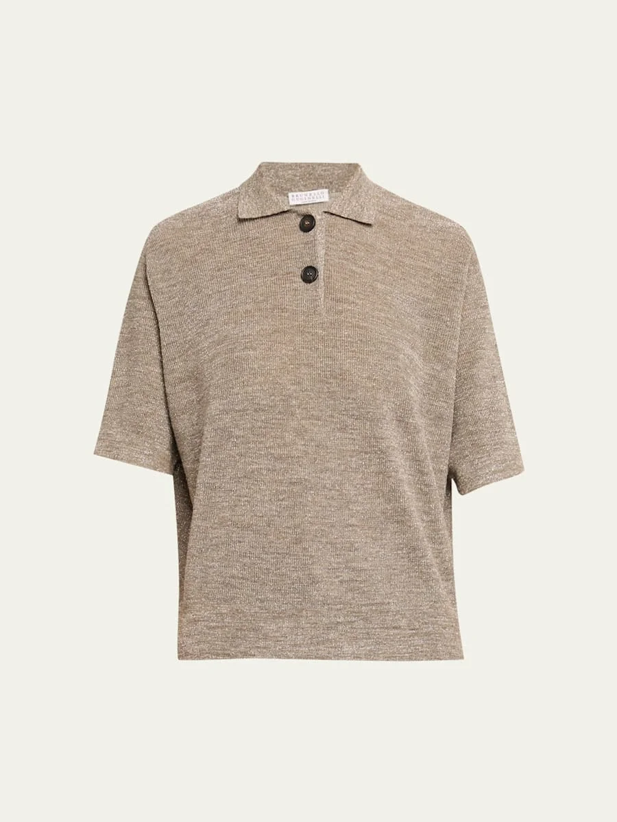 Brunello Cucinelli polo shirt is crafted from shimmering metallic linen knit Point collar; threebutton front Short sleeves Relaxed fit Ribbed cuffs and hem Pullover style Linen/polyester Made in Italy