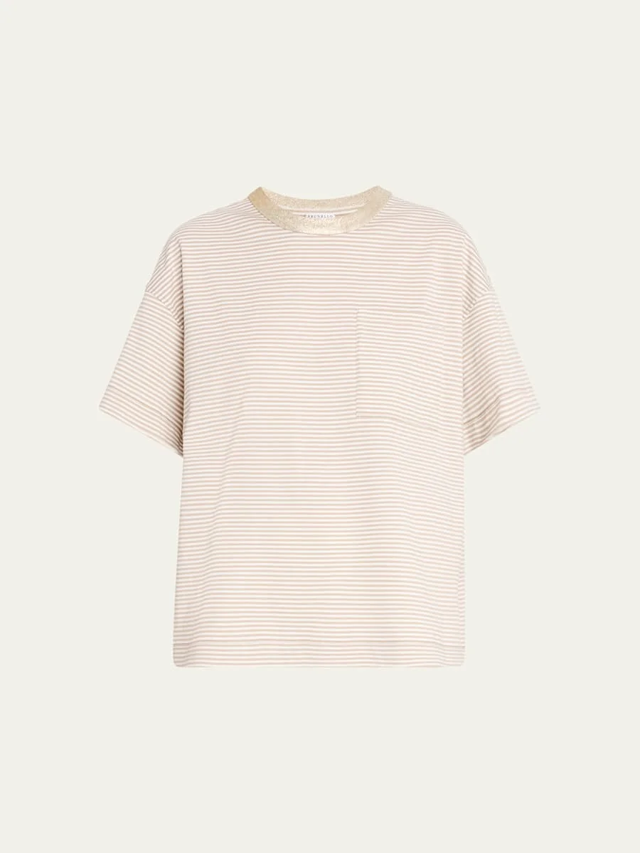 Brunello Cucinelli striped jersey Tshirt featuring a metallic collar detail Crew neckline Short sleeves Chest patch pockets Loose fit Pullover style Cotton Made in Italy