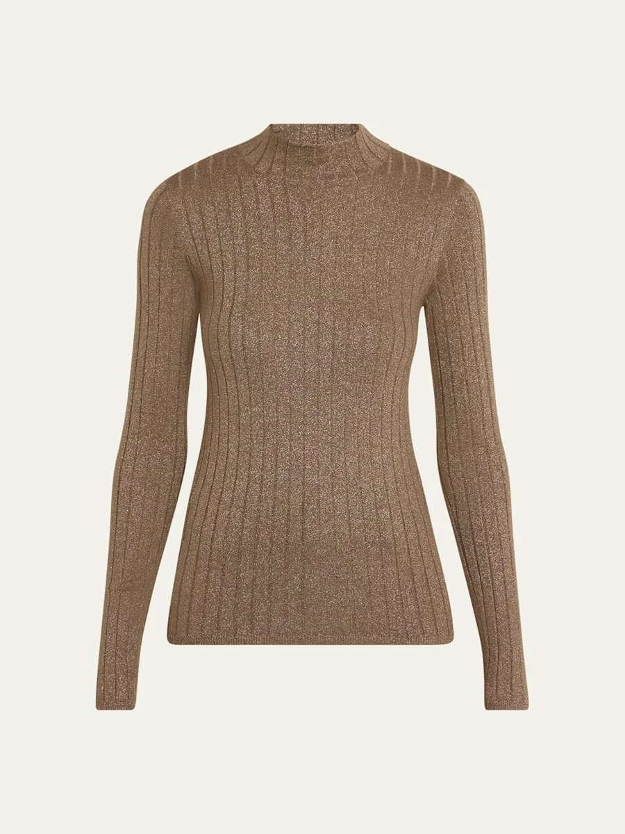 Brunello Cucinelli sweater in metallic wide ribbed knit Mock neckline Long sleeves Fitted Pullover style Cashmere/silk/nylon/polyamide/Lurex® metallic fibers Dry clean Made in Italy