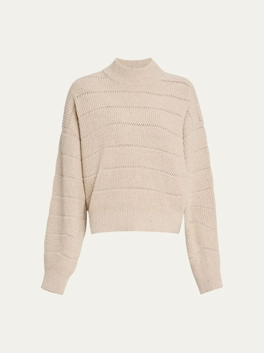 Mock-Neck Paillette Horizontal Open-Knit Sweater