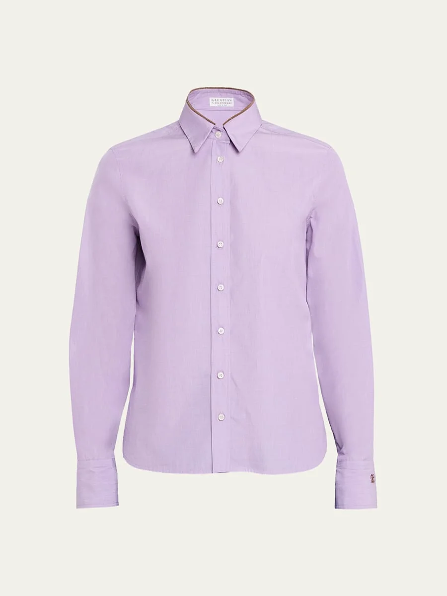 Brunello Cucinelli shirt crafted of cotton chambray features a signature monili embellished collar and a crest embroidered cuff Point collar; button front Long sleeves; button cuffs Yoked back; box pleat Relaxed fit Shirttail hem Cotton Made in Italy