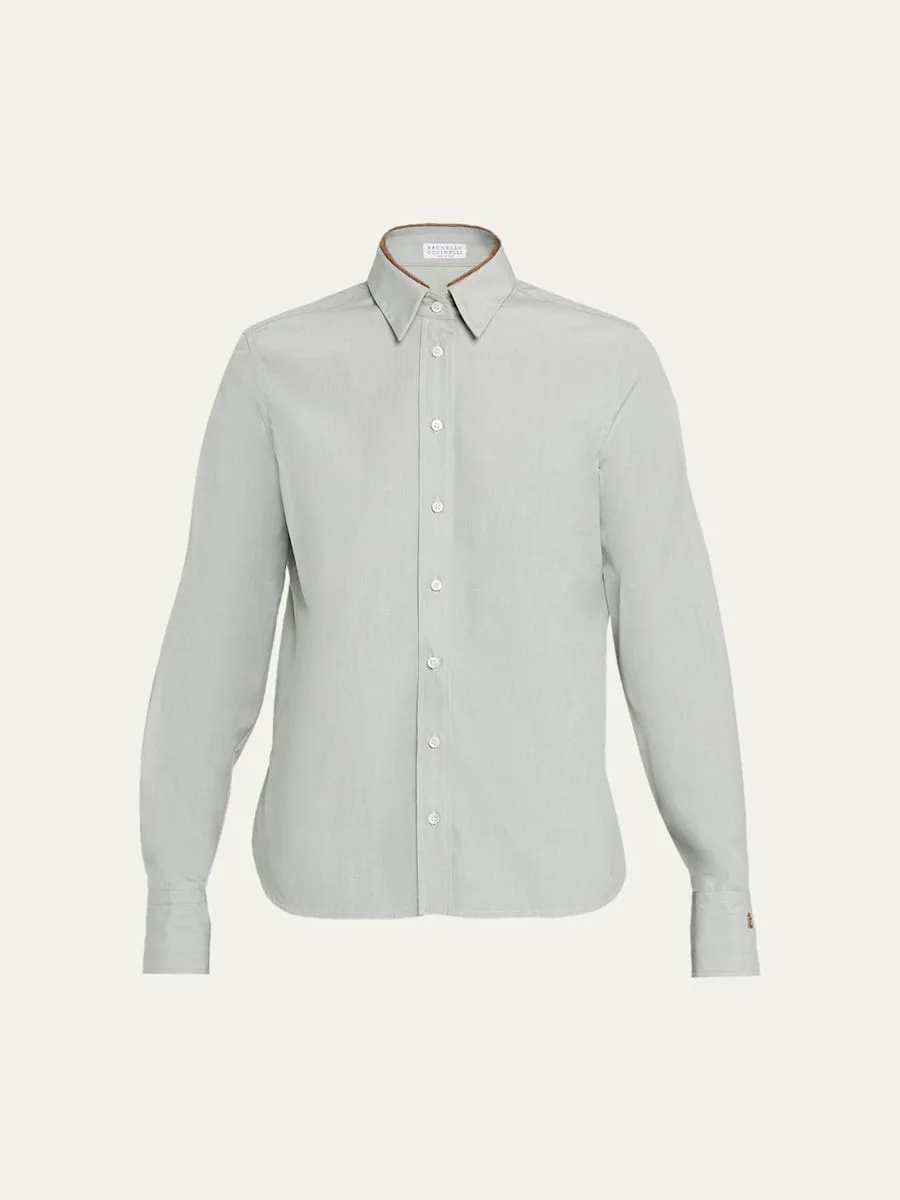Brunello Cucinelli shirt crafted of cotton chambray features a signature monili embellished collar and a crest embroidered cuff Point collar; button front Long sleeves; button cuffs Yoked back; box pleat Relaxed fit Shirttail hem Cotton Made in Italy