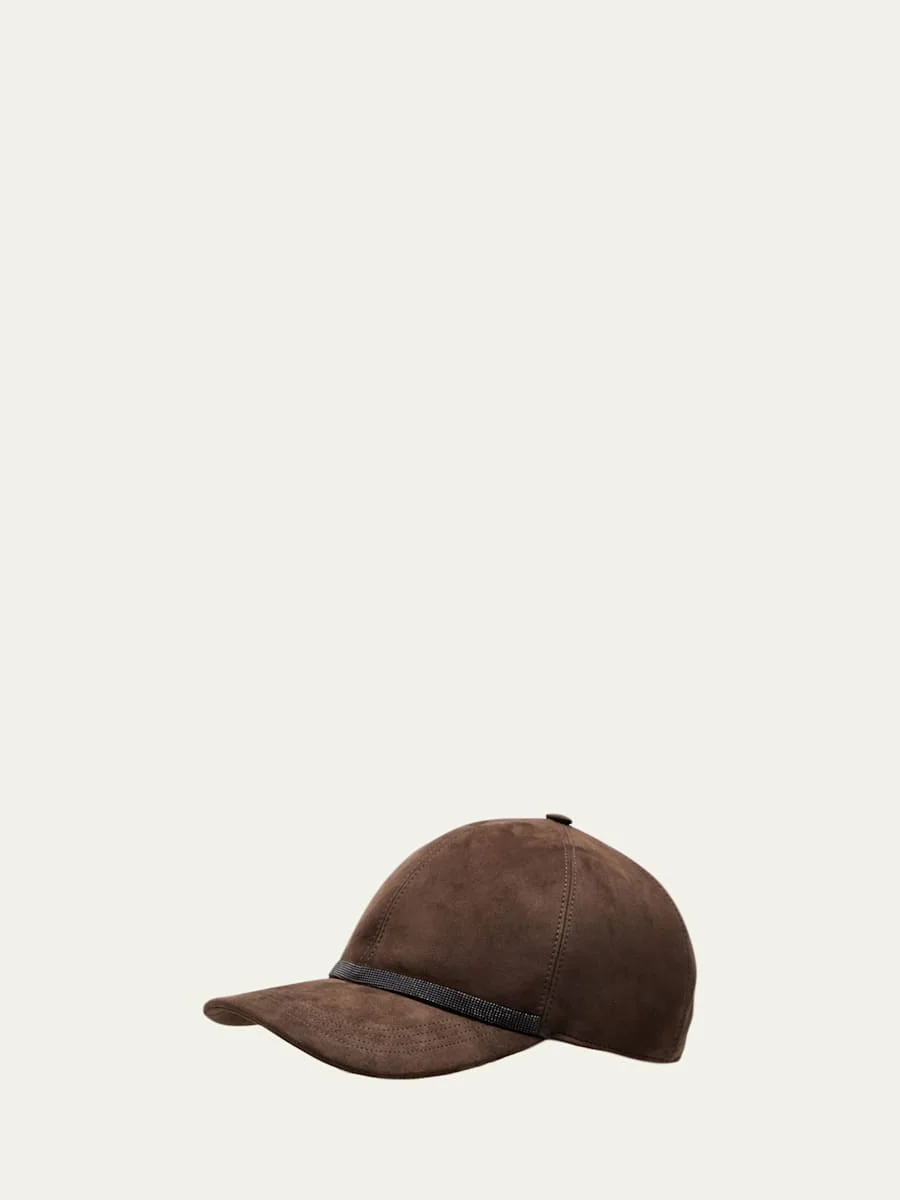 Brunello Cucinelli velvety suede baseball cap embroidered with monili trim Round paneled crown Curved brim Adjustable leather strap with buckle Leather/cotton/acetate Made in Italy
