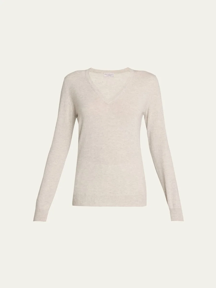 Brunello Cucinelli sweater is crafted from soft cashmere knit accented with monili embellishment on the back of the neck V neckline Long sleeves Relaxed fit Ribbed cuffs and hem Pullover style Cashmere Made in Italy
