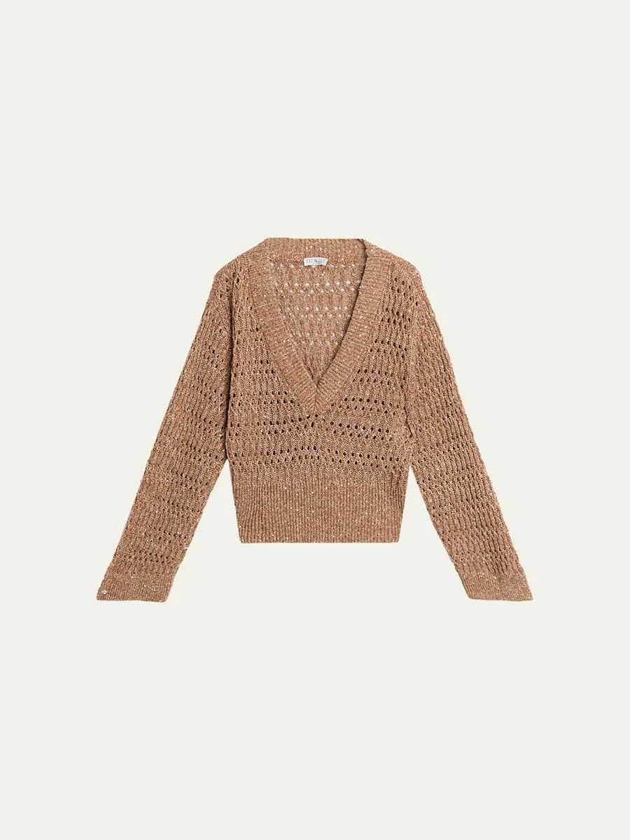 Brunello Cucinelli sweater is crafted of an openwork braided paillette knit featuring a thick waistband V neckline Long sleeves Relaxed fit Ribbed cuffs and hem Pullover style Linen/nylon/polyamide Dry clean Made in Italy