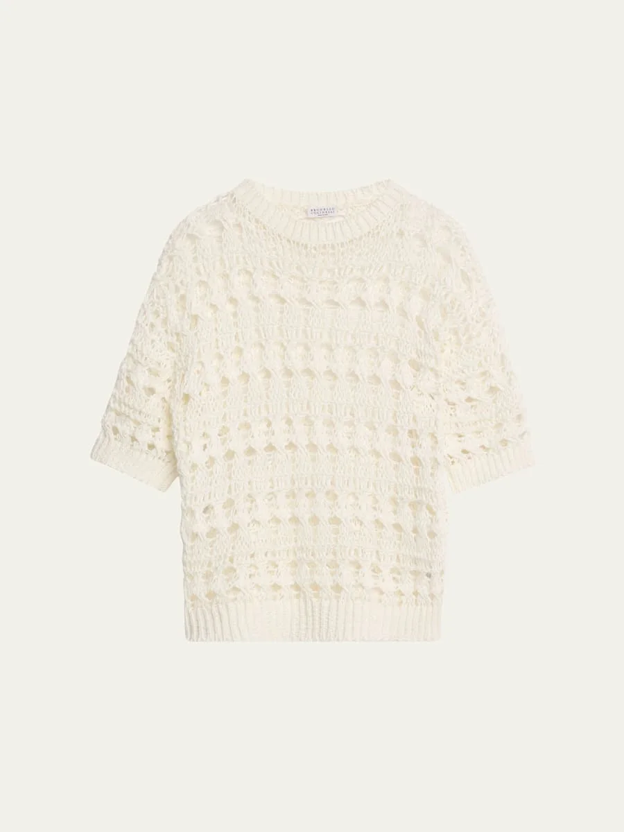 Brunello Cucinelli jute openwork knit top Crew neckline Elbowlength sleeves Relaxed fit Pullover style Jute/cotton/nylon/polyamide Made in Italy