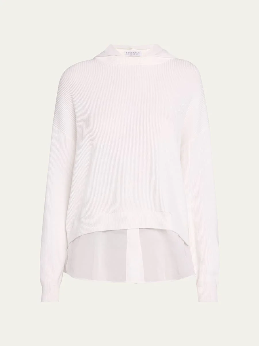 Brunello Cucinelli shirt in ribbed knit and organza combo Hooded neckline Long sleeves; ribbed cuffs Shirttail hem Pullover style Cotton Made in Italy Online Inquiries: BGS21_BB5YN| Store Inquiries: #4916761