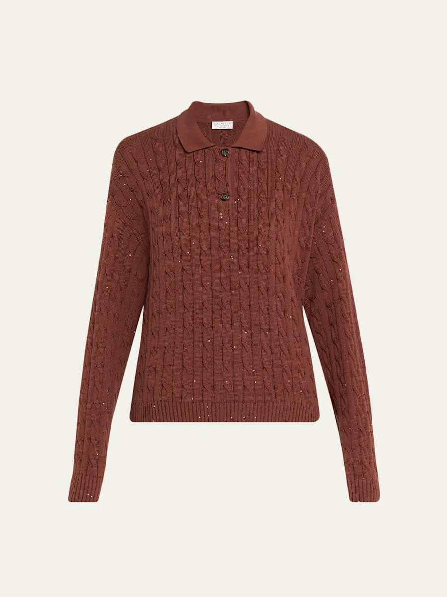 Brunello Cucinelli polo sweater is crafted from cable knit accented with speckles of shimmering micro paillettes Spread collar; twobutton front Long sleeves Drop shoulders Relaxed fit Hip length Ribbed cuffs and hem Pullover style Cotton/polyester/linen Made in Italy