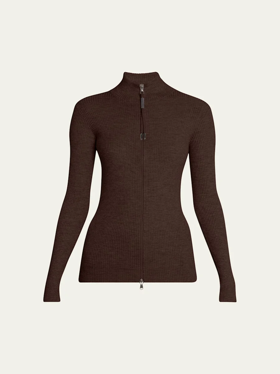 Ribbed Long-Sleeve Monili Zip-Up Top