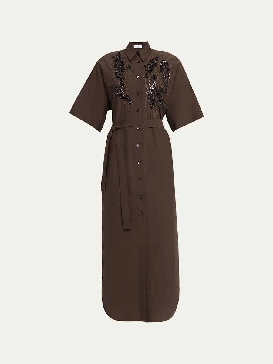 Sequin Embroidered Cotton Poplin Midi Shirtdress