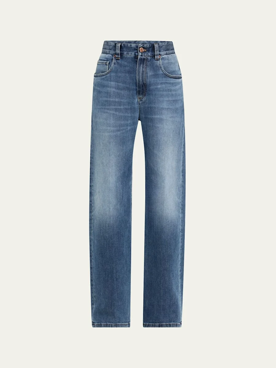 Brunello Cucinelli soft denim stove pipe jeans fetauring fading, slight whiskering, and signature monili belt loop detail High rise Fivepocket style Loose straight legs Full length Button/zip fly; belt loops Cotton/elastane Made in Italy
