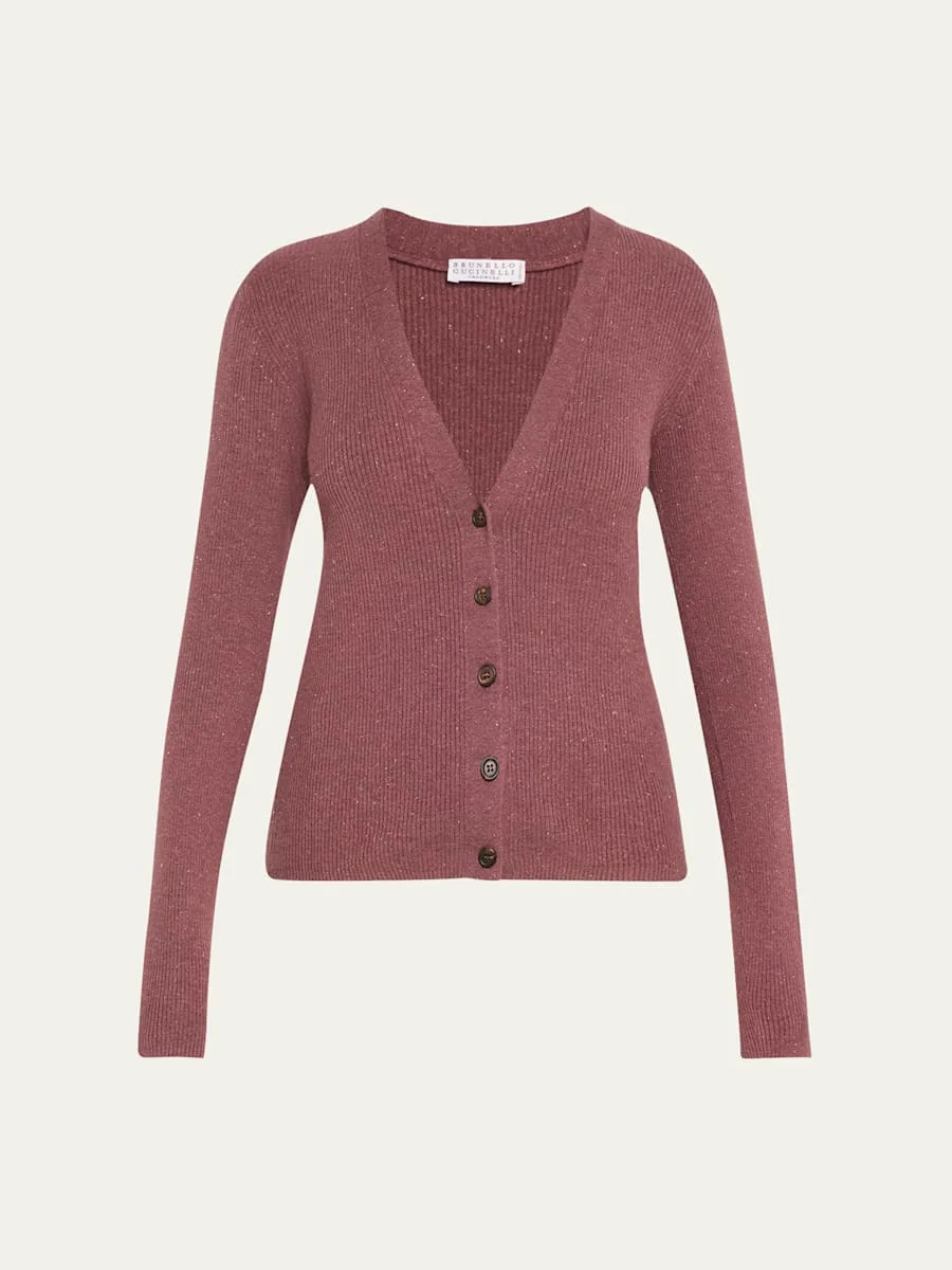 Brunello Cucinelli stretch lurex ribbed cardigan V neckline; button front Long sleeves Relaxed fit Cashmere/viscose/polyester Made in Italy