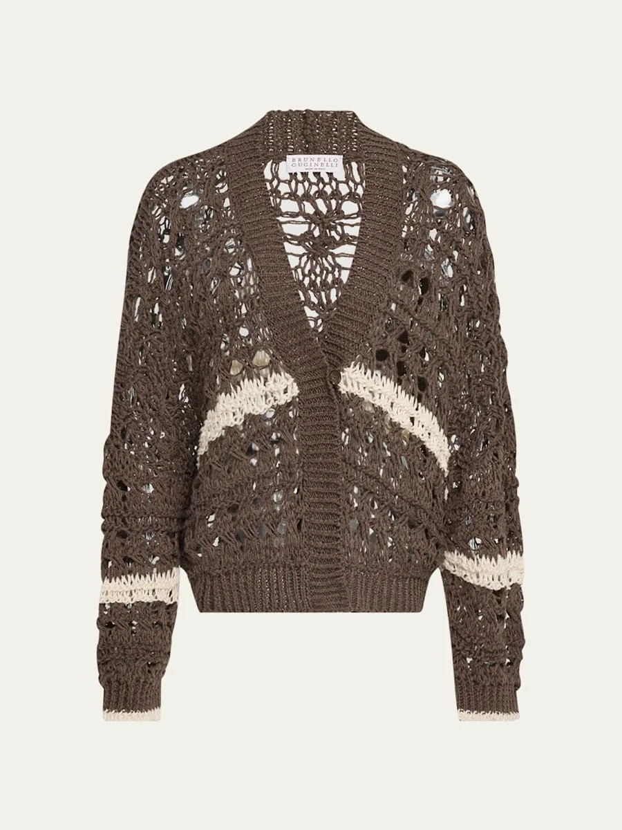 Stripe Cotton-Jute Open Knit V-Neck Cardigan