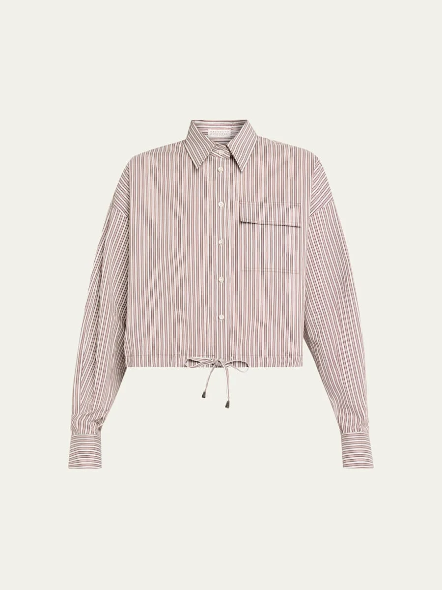 Brunello Cucinelli shirt is crafted from crispy cottonsilk poplin accented with a striped print and a drawstring hem detail Point collar; button front Long sleeves; button cuffs Yoked back; box pleat Chest flap pocket Boxy fit Hip length Drawstring hem Cotton/silk Made in Italy