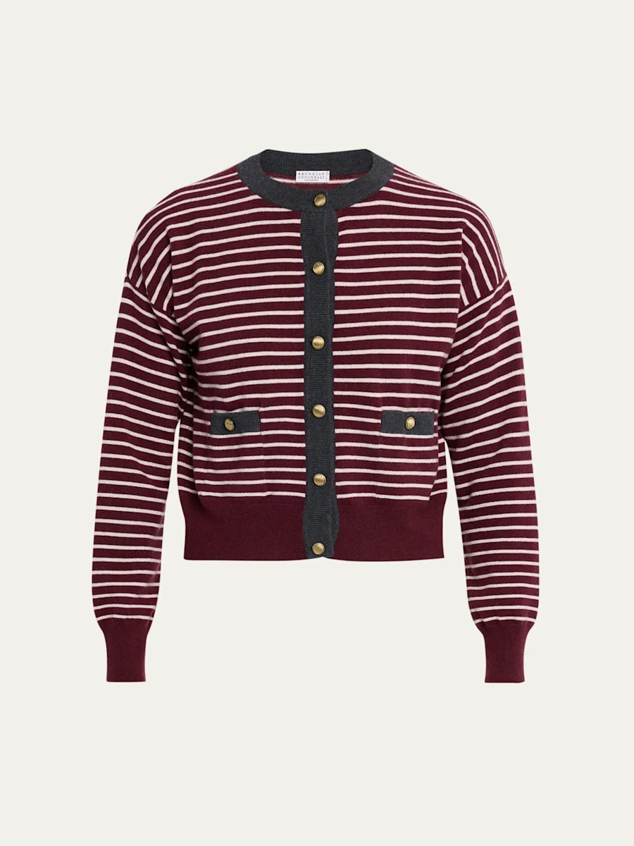 Brunello Cucinelli striped knit cardigan featuring bicolor ribbed trim Crew neckline; button front Long sleeves Hip button-welt pockets Relaxed fit Ribbed cuffs and hem Virgin wool/cashmere/silk Dry clean Made in Italy Online Inquiries: BGS21_BA4FR| Store Inquiries: #5033287