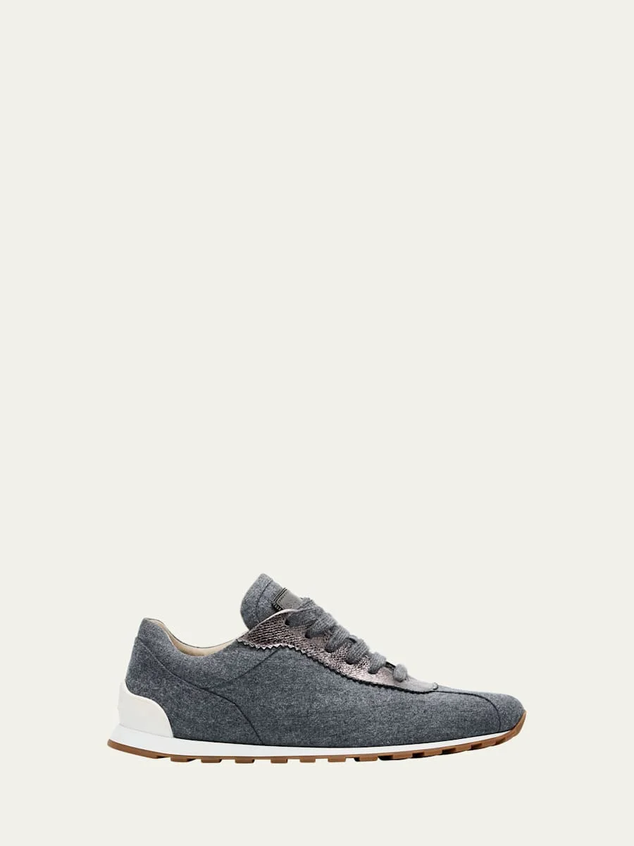 Brunello Cucinelli low-top knit runner sneakers in suede and melamine 0.17 in / 5 mm flat heel Round toe Elastic lace-up vamp Rubber outsole Lining: Cotton/suede Made in Italy Online Inquiries: BGS21_X6XM0| Store Inquiries: #5040427
