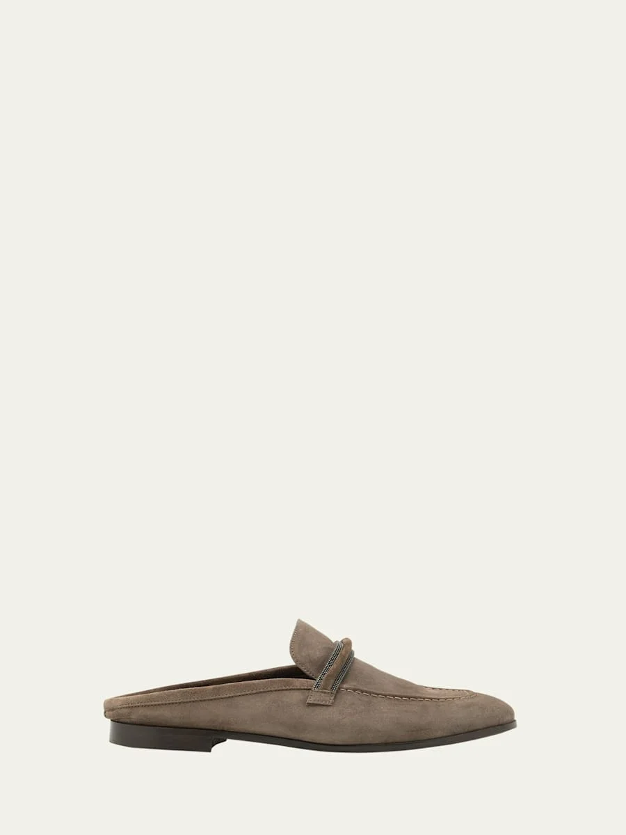 Brunello Cucinelli soft calf suede loafer mules with beaded monili strap Flat heel Round moc toe Notched vamp Slide style Leather outsole Lining: Leather Made in Italy Online Inquiries: BGS21_X6UU8| Store Inquiries: #4981365