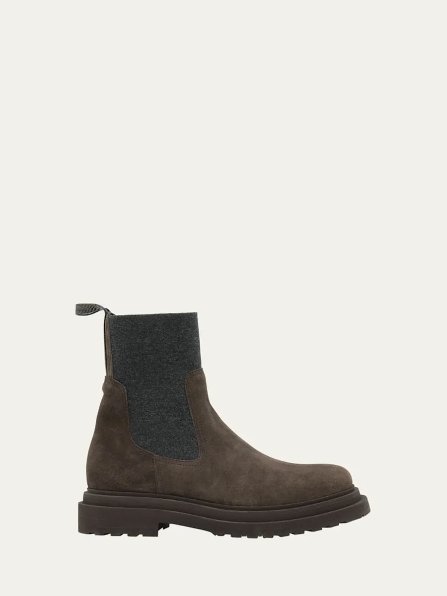 Brunello Cucinelli suede Chelsea boots with soft virgin wool sock collar and monili embellished pull tab accent Flat heel Round toe Pullon style Lugged rubber outsole Lining: Leather Made in Italy