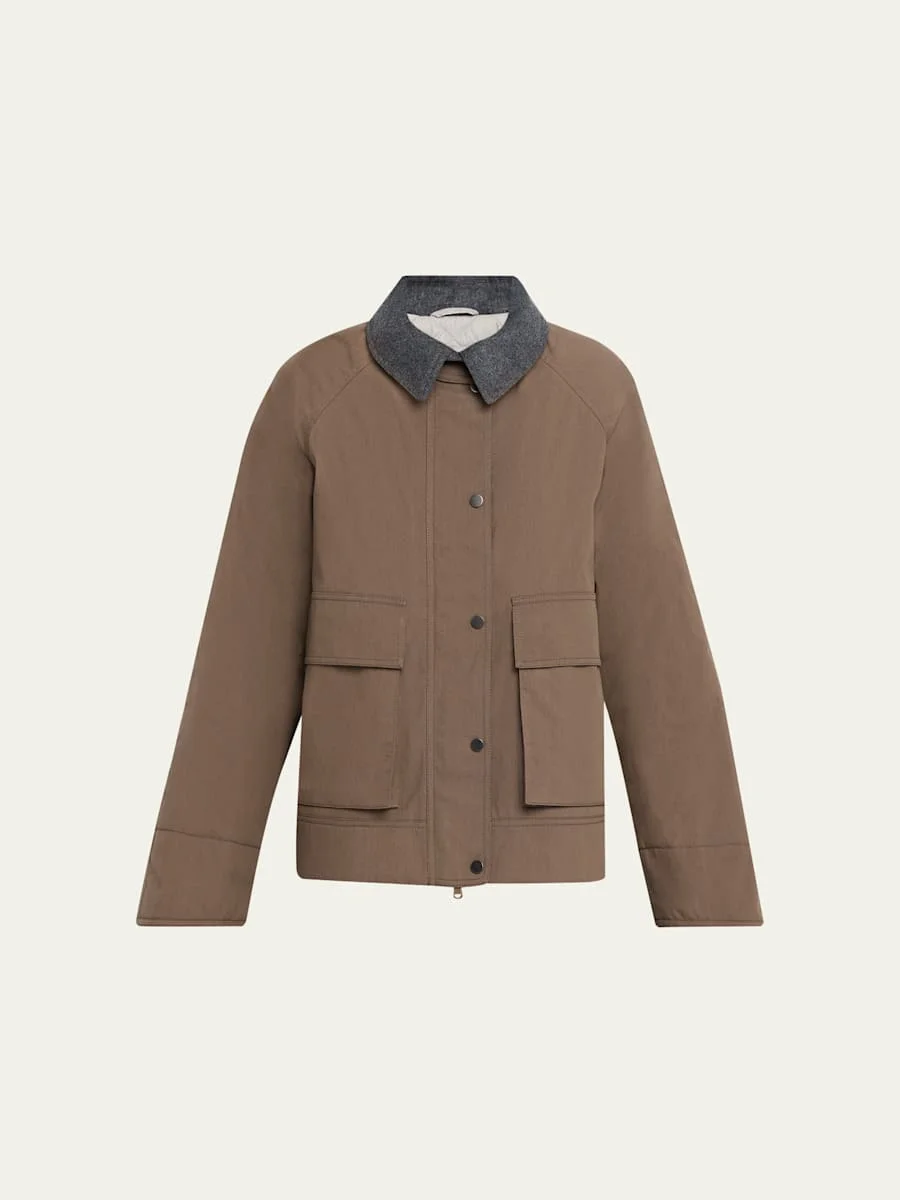 Crafted from Techno cotton canvas, this jacket by Brunello Cucinelli features a dry hand with a slightly matte appearance Contrasting wool collar Long raglan sleeves Front flap patch pockets Relaxed fit Mid-length Front zip/snap placket Virgin wool/cotton/nylon/polyamide Lining: Nylon Made in Italy Online Inquiries: BGS21_B9W81| Store Inquiries: #4986584