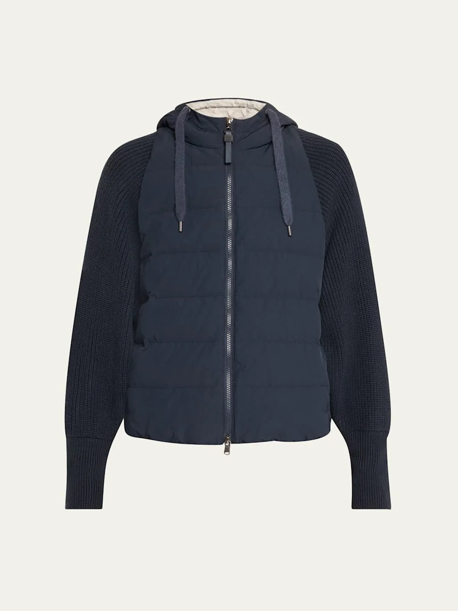 Brunello Cucinelli techno crinkled down hooded jacket Twoway zip front; drawstring Long ribbed sleeves Relaxed fit Nylon/polyamide/virgin wool/cotton Lining: Nylon Down feather fill Made in Italy
