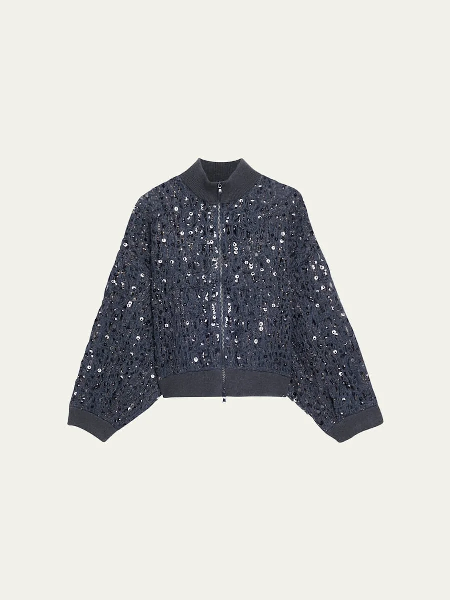 Wool-Cashmere Paillette Open-Knit Zip Cardigan