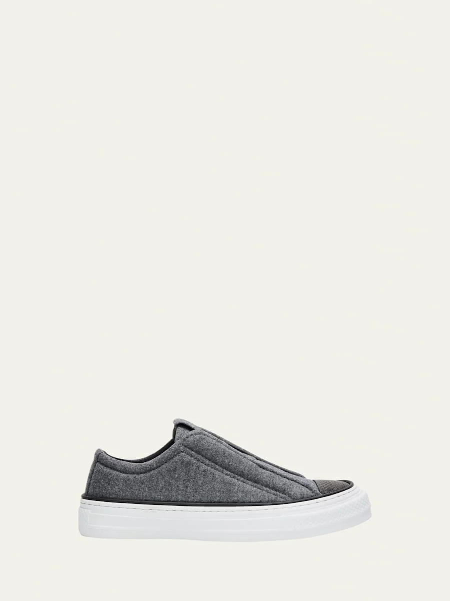 Brunello Cucinelli virgin wool low-top sneakers with beaded monili detailing Flat heel Round embellished cap toe Laceless vamp Slip-on style Rubber outsole Lining: Leather Made in Italy Online Inquiries: BGS21_X6UUJ| Store Inquiries: #4981393