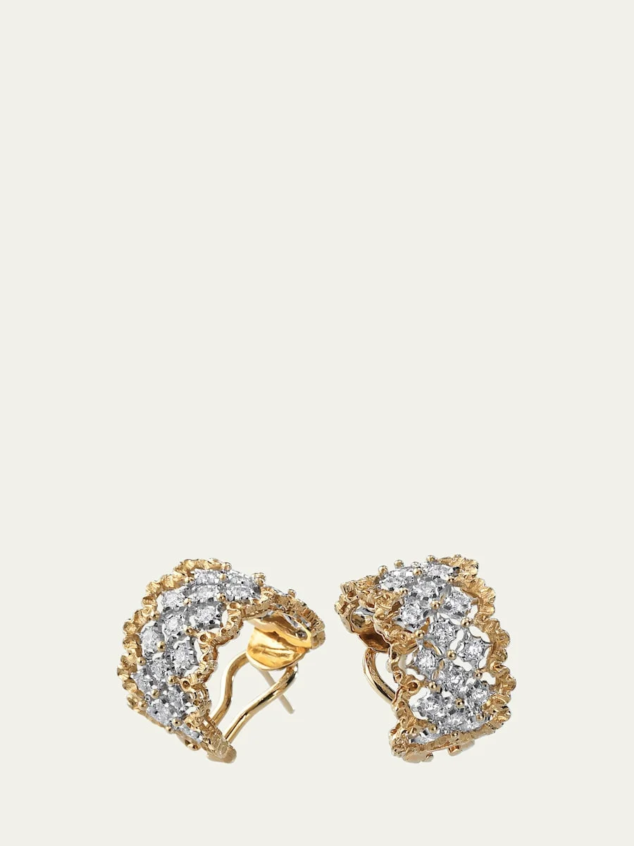 These huggie earrings from Buccellati are two-tone and feature a scalloped edge. The center is set with round brilliant-cut diamonds. Polished 18-karat yellow gold and white gold 0.91 total diamond carat weight Omega clips for support For pierced ears Made in Italy Online Inquiries: BGS21_PMSWG| Store Inquiries: #5036405
