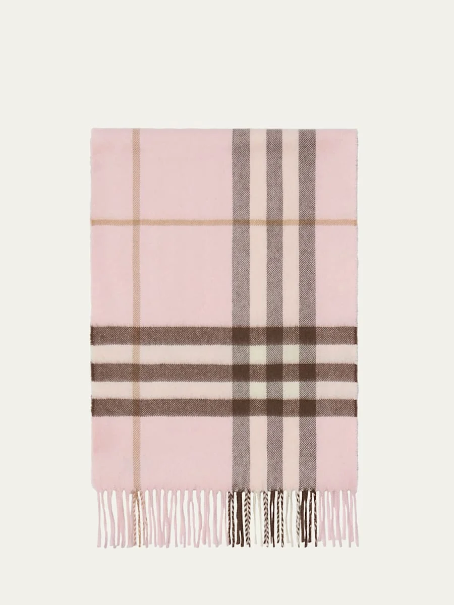 Burberry cashmere scarf woven with the house's iconic check pattern. Washed and brushed for natural luster and an ultrasoft finish. Fringed edges Approx. 66"L x 6.0"W Cashmere Professional cleaning recommended Imported