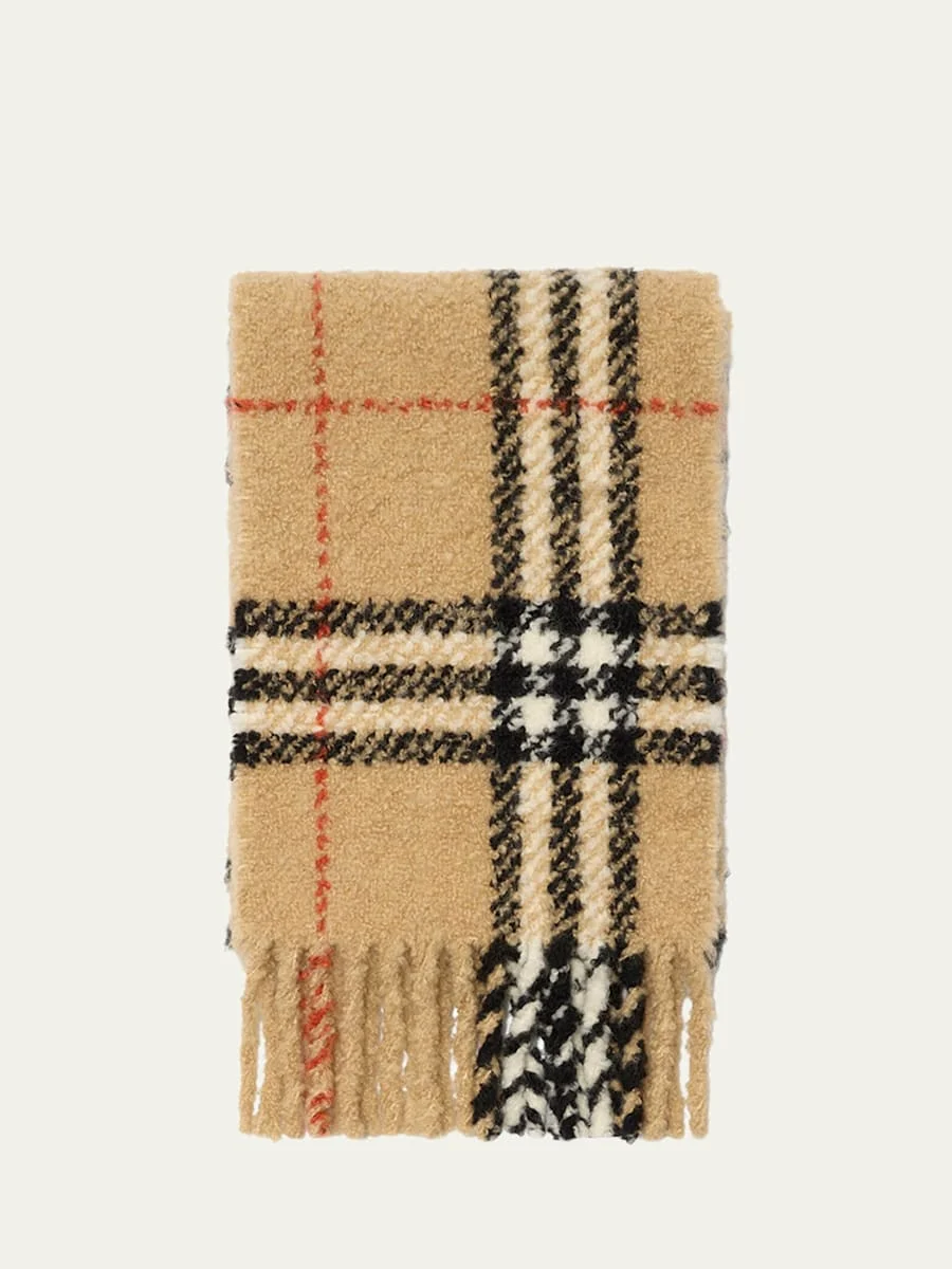 Crafted from an alpaca wool blend boucle, this Burberry scarf features the house's signature woven check pattern. Rectangular Fringing at both ends Can be styled multiple ways Approx. 66"L x 12.0"W Wool/nylon/polyamide Professional cleaning recommended Made in Italy