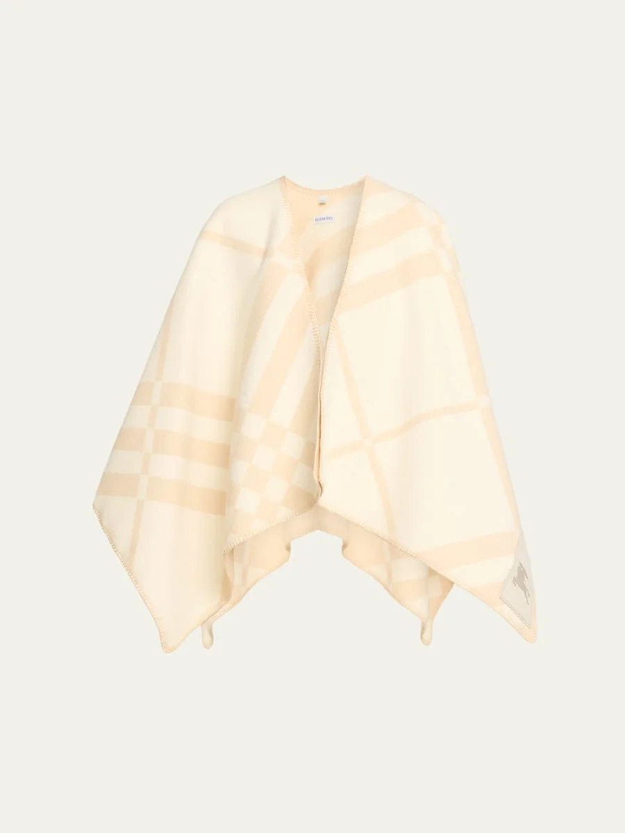 Crafted of soft wool cashmere, this Burberry cape flaunts a jacquardwoven twotone check pattern on an exaggerated scale. Approx. 55"L x 55.0"W Blanket stitching at edges Tonal suede label embossed with the Equestrian Knight Design. Wool/cashmere/leather Professional cleaning recommended Trim: Suede Imported