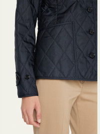 Burberry diamond quilted jacket Spread collar; button front Long sleeves; belted cuffs Patch pockets Fitted Polyester/calf leather Cotton/polyester lining Polyester fill Imported Model is 5'10"/177cm. Online Inquiries: BGS21_B7S2P| Store Inquiries: #4410149